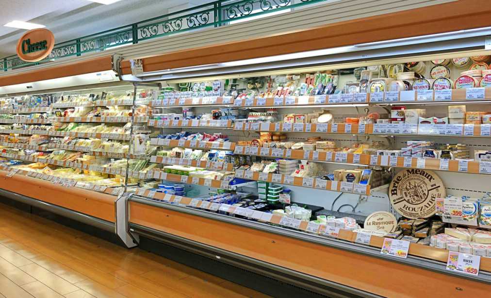 まず驚くべきはこのチーズコーナーの大きさ!この1列、手前から奥までずらっと世界中のチーズが並びます。サラダやピッツァ、そのほか伝統料理など、海外の食卓にチーズは欠かせないんだとか。日本ではあまり知られていないチーズが多く揃っており、もはやチーズ専門店と言ってもいいくらい。