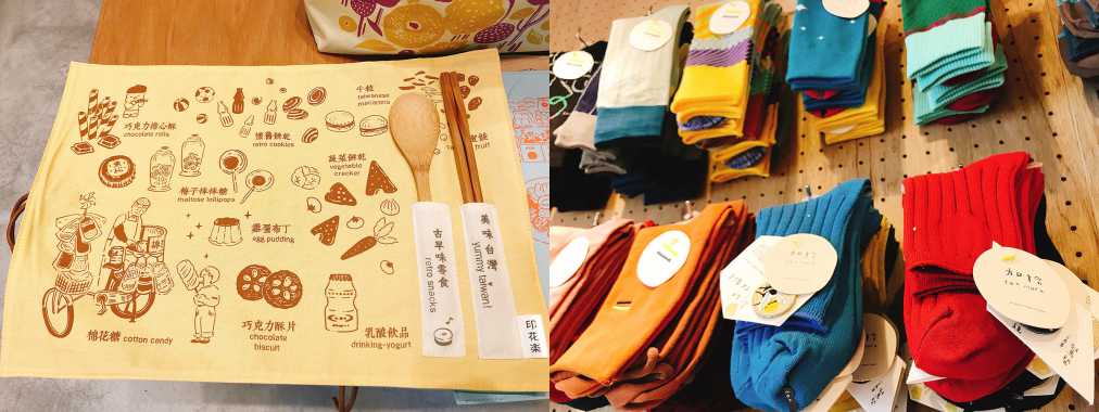 「ランチョンマット」(2062円)や、台湾の人気ソックスブランドのカラフルな靴下など、思わず手に取りたくなるキュートな台湾雑貨がたくさん!雑貨好きな友達へのギフトにも最適です。