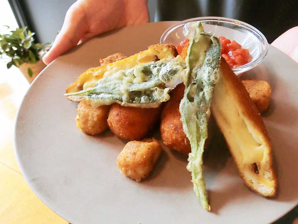 「水牛モッツァレラのフリット盛り合わせ」(2050円)はワインと一緒にどうぞ。ほかにもラザニアやパスタ、リゾットなどモッツァレラ料理が盛りだくさん。モッツァレラの風味を楽しめるよう、すべてのメニューがにんにくや玉ねぎを不使用というこだわりです!