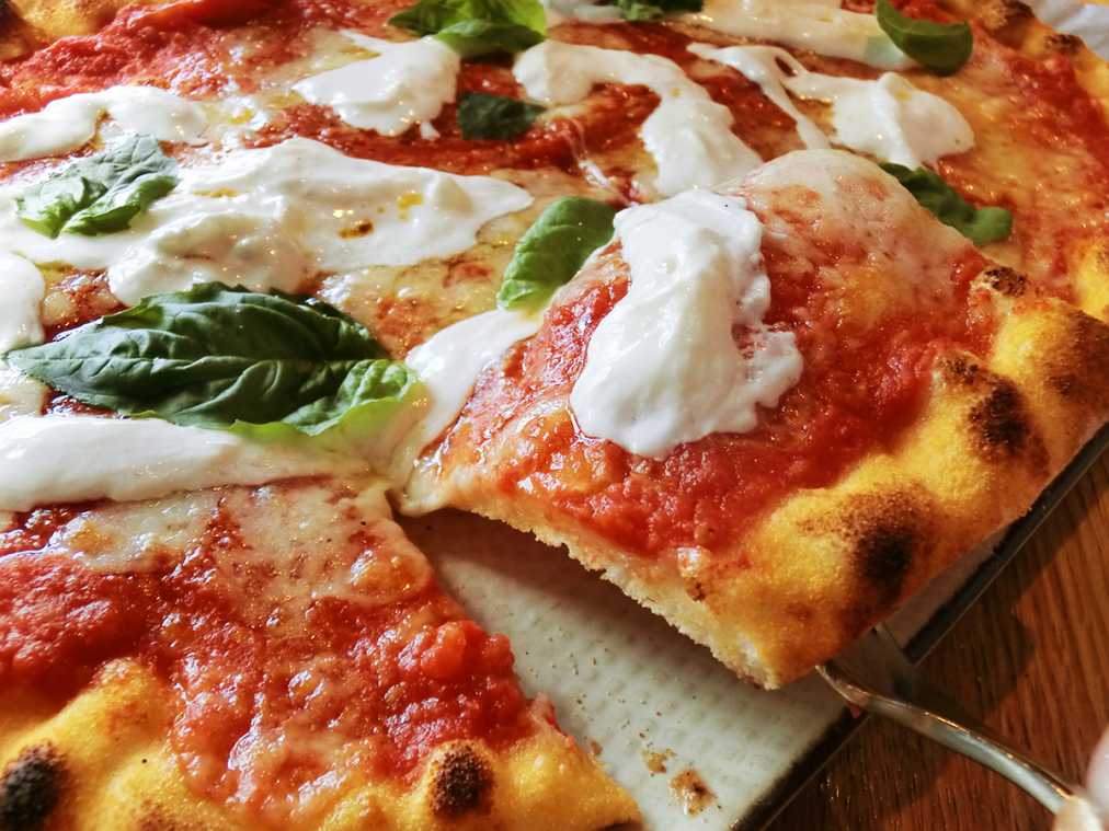 パリッと軽やかなローマ伝統のピッツァ生地“ピンサ”にとろ~っとクリーミーなストラッチャテッラ(モッツァレラチーズと生クリームをあえたもの)、さらにうまみの強いトマトソースが相まって、信じられないほどおいしいピッツァです!