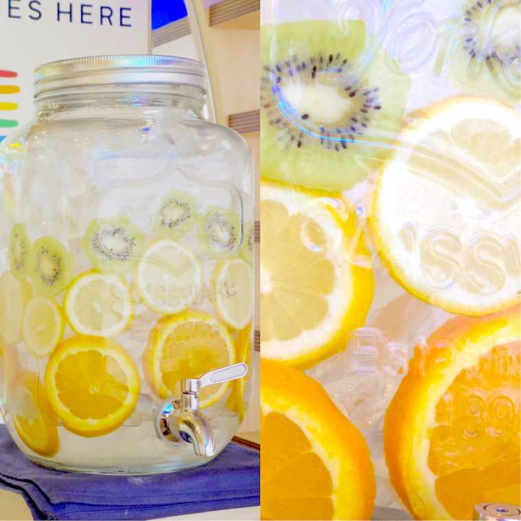 店内にはオレンジ、レモン、キウイがふんだんに入った無料のフルーツ・ウォーターサーバーを完備。お喋りで喉が乾いたら、ほのかにフルーツが香るお水で喉を潤しましょう。