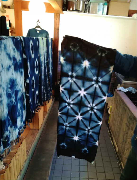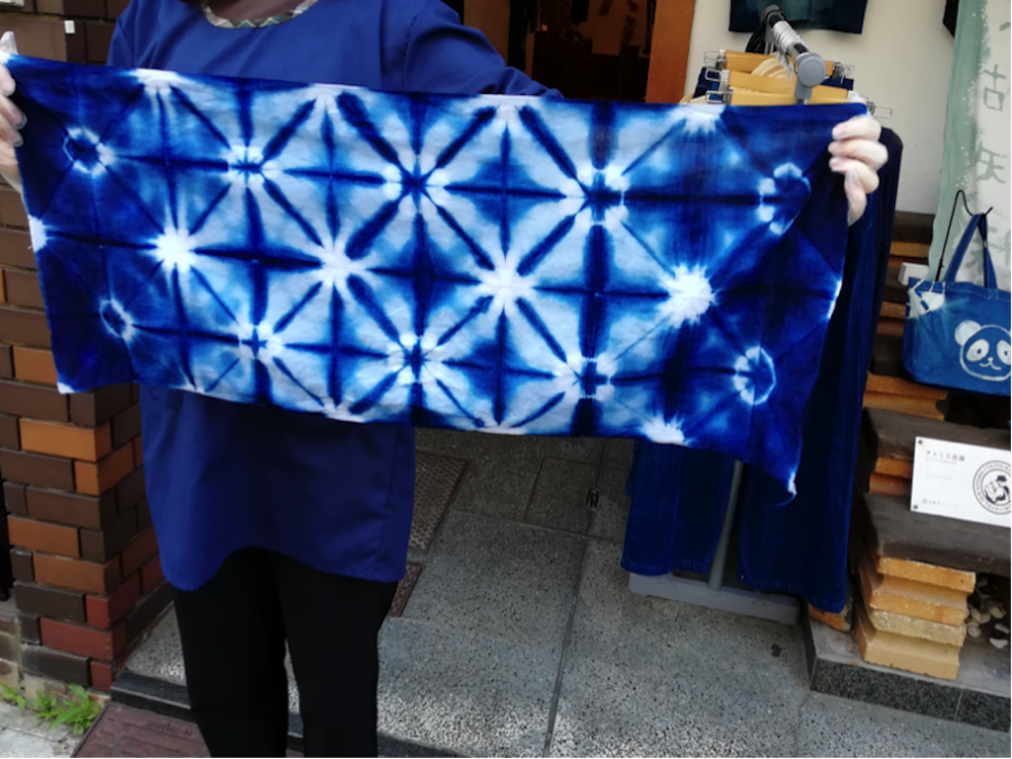 「太陽の下で見る方が鮮やかだよ」という職人さんの言葉に導かれるまま外に出ると、藍が太陽の光を受け、店内で見るよりきれいな色に!和を感じる落ち着いた色合いに仕上がって大満足です。