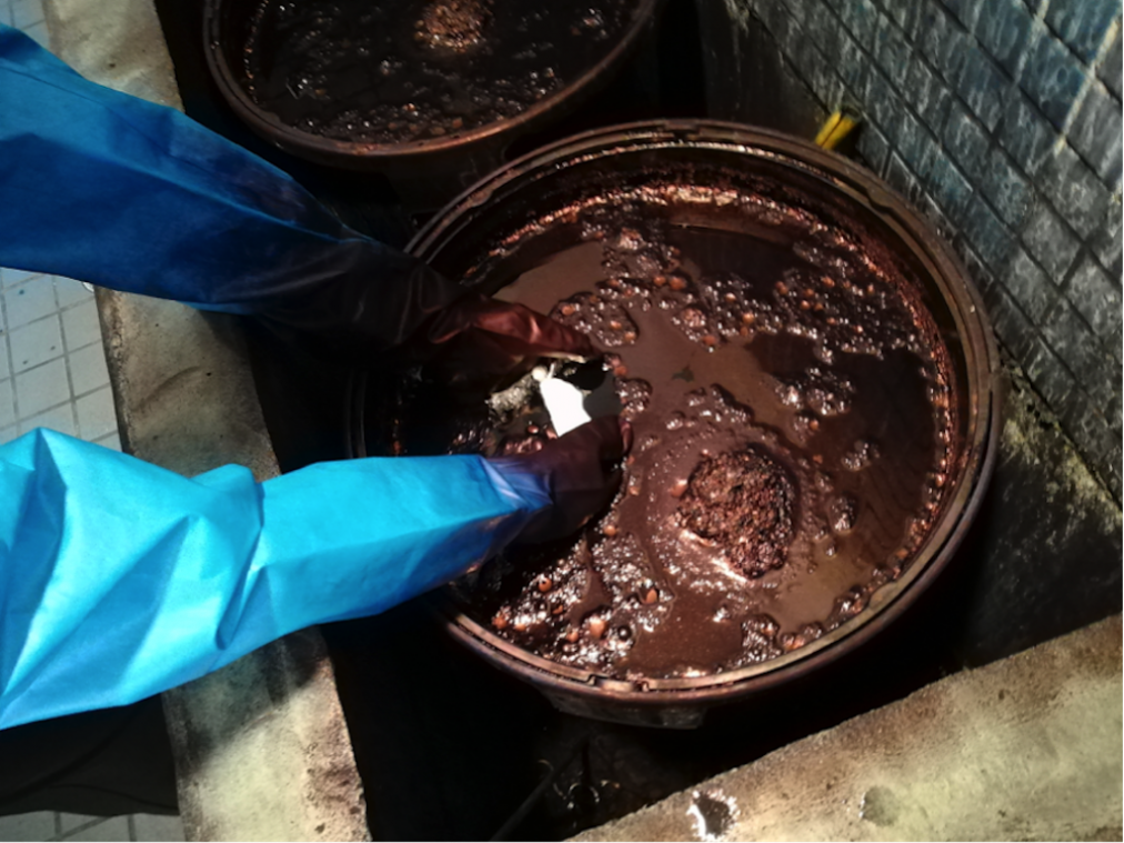 まずは藍染め液がよく浸透するように手ぬぐいを水に浸けます。ぎゅっと絞ったらいよいよ藍染め液の中へ。ひやっとして何だか気持ちいい!藍染め液は、“すくも”と呼ばれる染料を発酵させているため、クセのある独特な匂いが漂います。