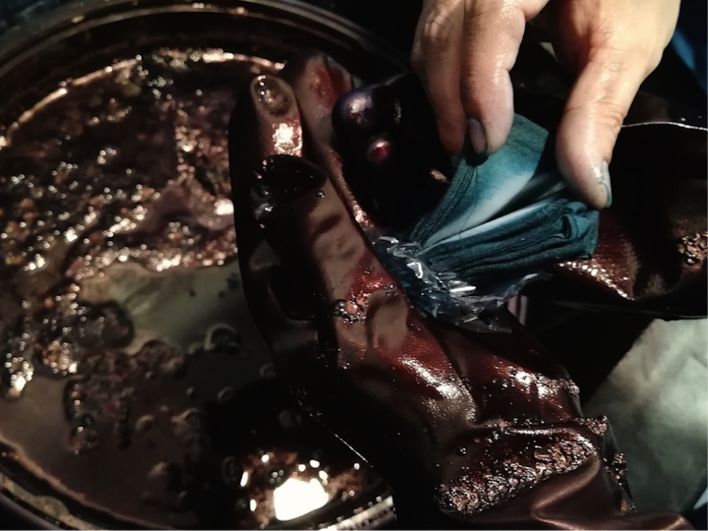 バケツの中でしっかり布をもんで、生地に液を染み込ませていきます。「しっかり染まりますように。綺麗な色になりますように」と強く念じながらまずは1〜2分ほど染色。