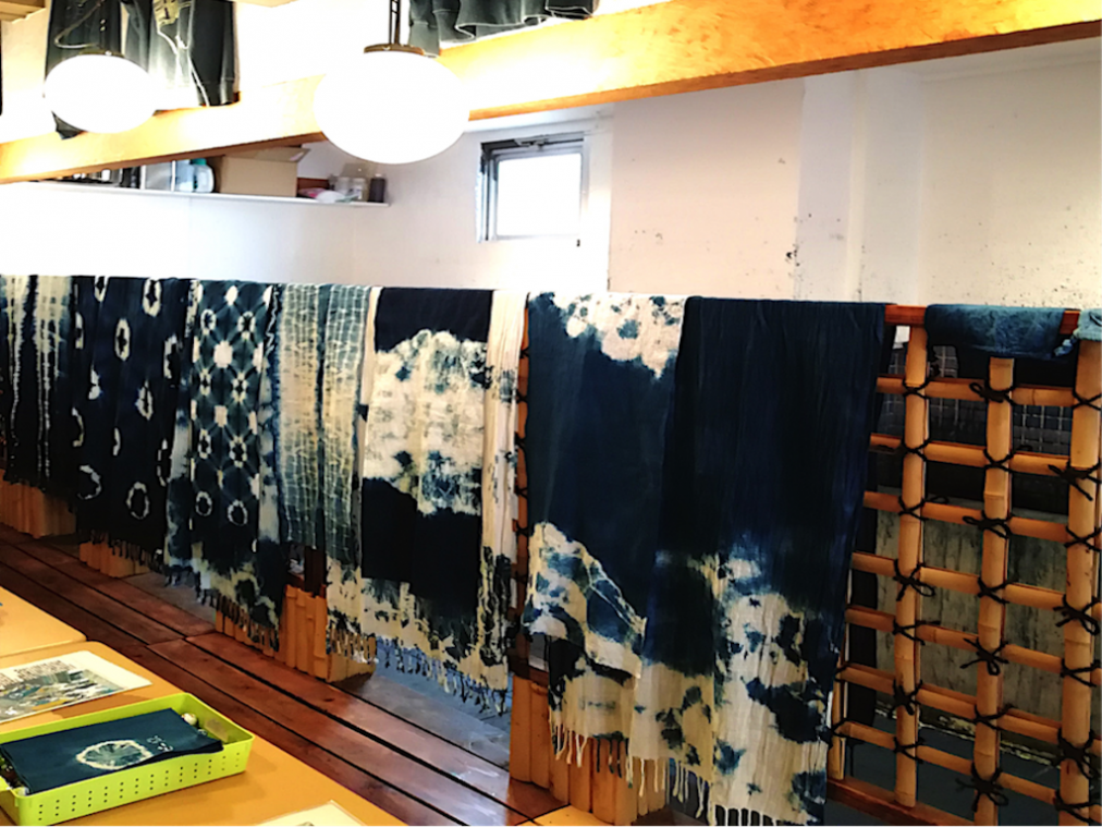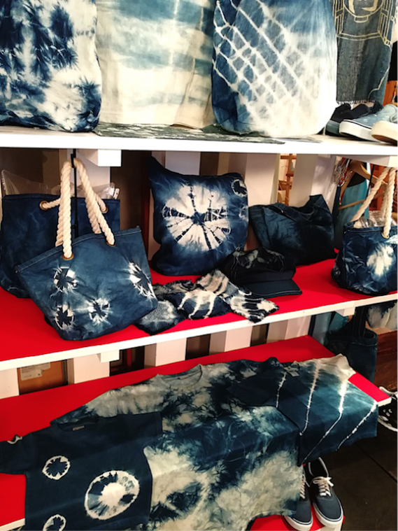 「和なり屋」の店内には藍染めのTシャツやカバンなどが飾られ、販売もしています。藍染め体験のほかに機織り体験もできる「和なり屋」は、日本文化に興味を持つ外国の方にも人気のスポットとなっているそう。