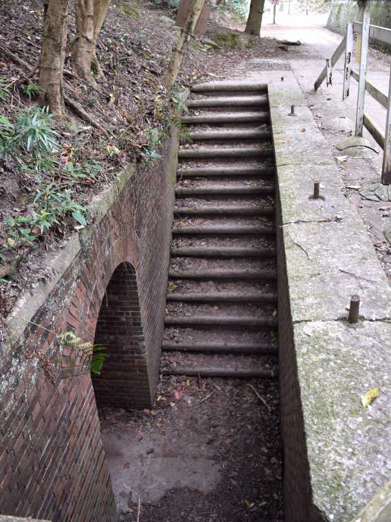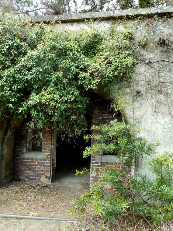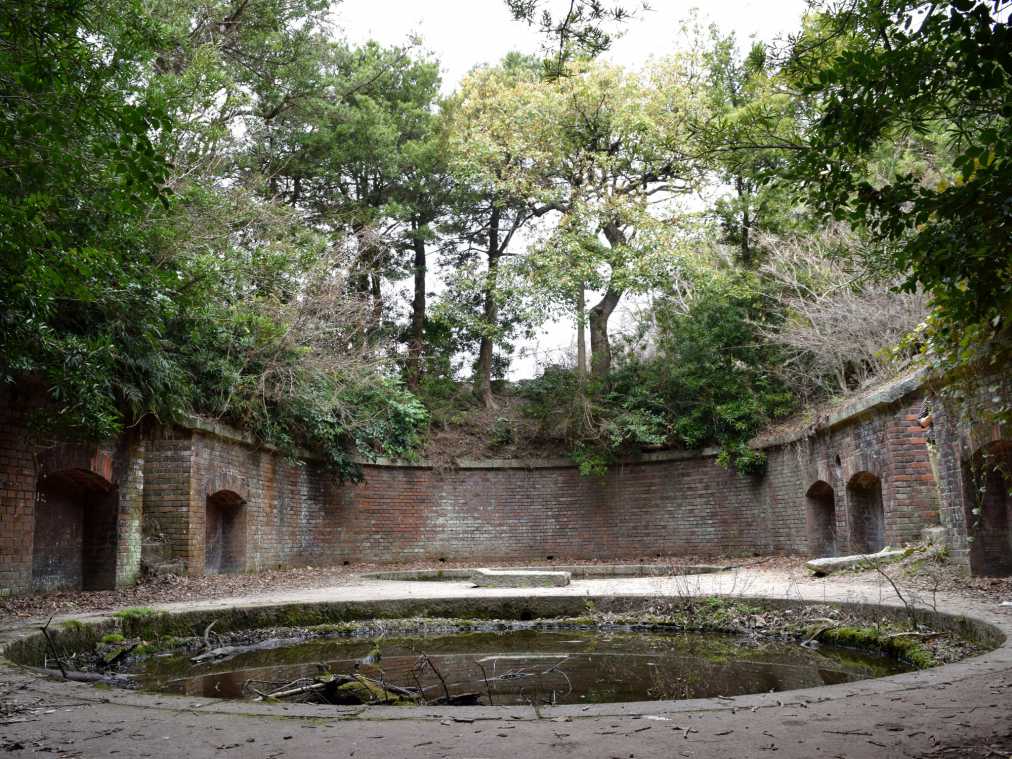 落ち葉の積もった道をグングン歩いていると、なんだか探検気分に。童心にかえって、好奇心の赴くままに進んでいきます。こちらは桟橋からもっとも近い「第5砲台跡」。レンガとコンクリートで造られた砲台跡には、草木が生い茂り、独特な雰囲気を醸し出していますね。