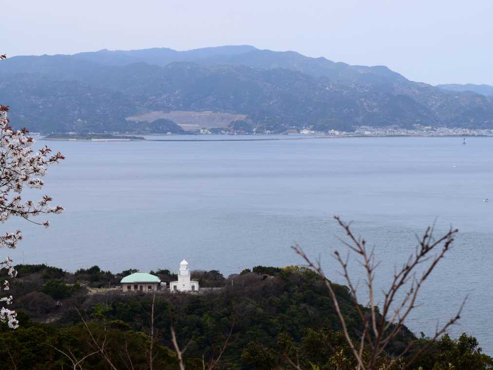 「第3砲台跡」の近くにある「タカノス山展望台」に登ってみると、対岸に淡路島が見えます。手前に見えるのは「友ヶ島灯台」。1872年に建てられた洋風建築の灯台は、今も現役で活躍しています。
