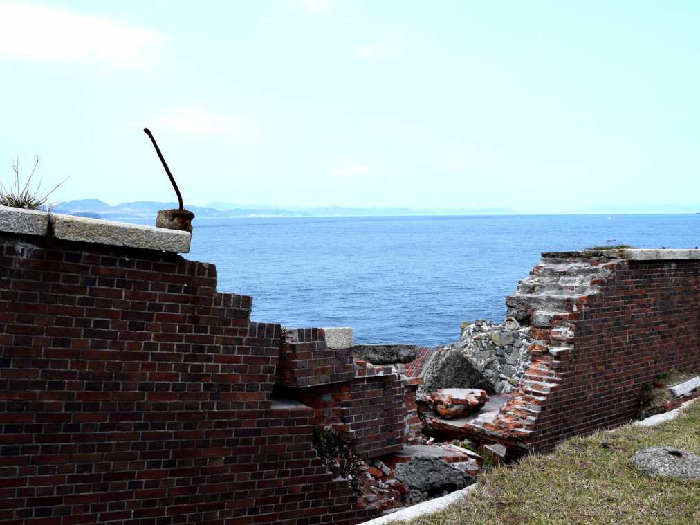 海辺に立っているのは「第2砲台跡」。残念ながら内部は立ち入り禁止。崩れたり大きくひびが入ったりしているのが、味があっていいですよね。青い空と海をバックに1枚パシャリ。