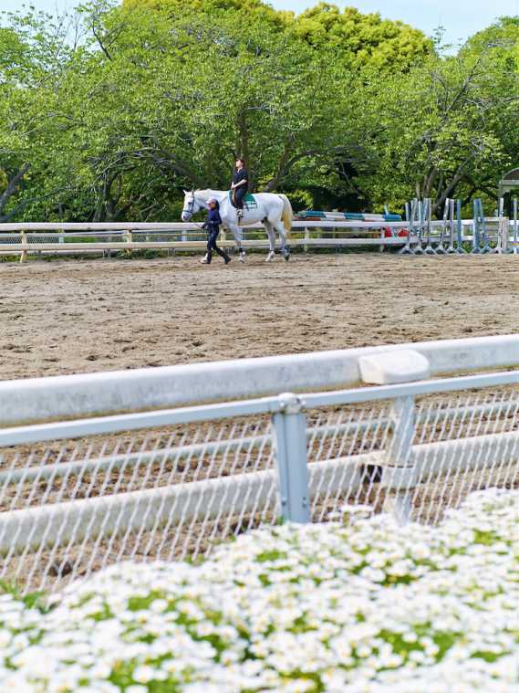 引き馬はスタッフさんが付いてくれるので、馬に乗るのがはじめてでも安心。この日の相方は美しい白い馬体と可愛らしい目が特徴のヴァオドゥーくん。穏やかでとっても優しい性格なんだとか。体高175cmから見下ろすウマの世界を体験してみるのも楽しい!