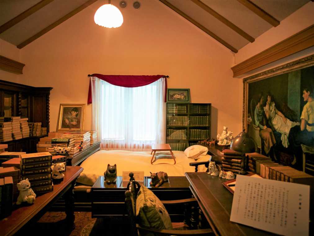 大佛氏の寝室兼書斎を再現した「記念室」。部屋の中をよく見てください。猫の置き物や絵画にも猫・猫・猫。常に20匹ほどいるのだとか。