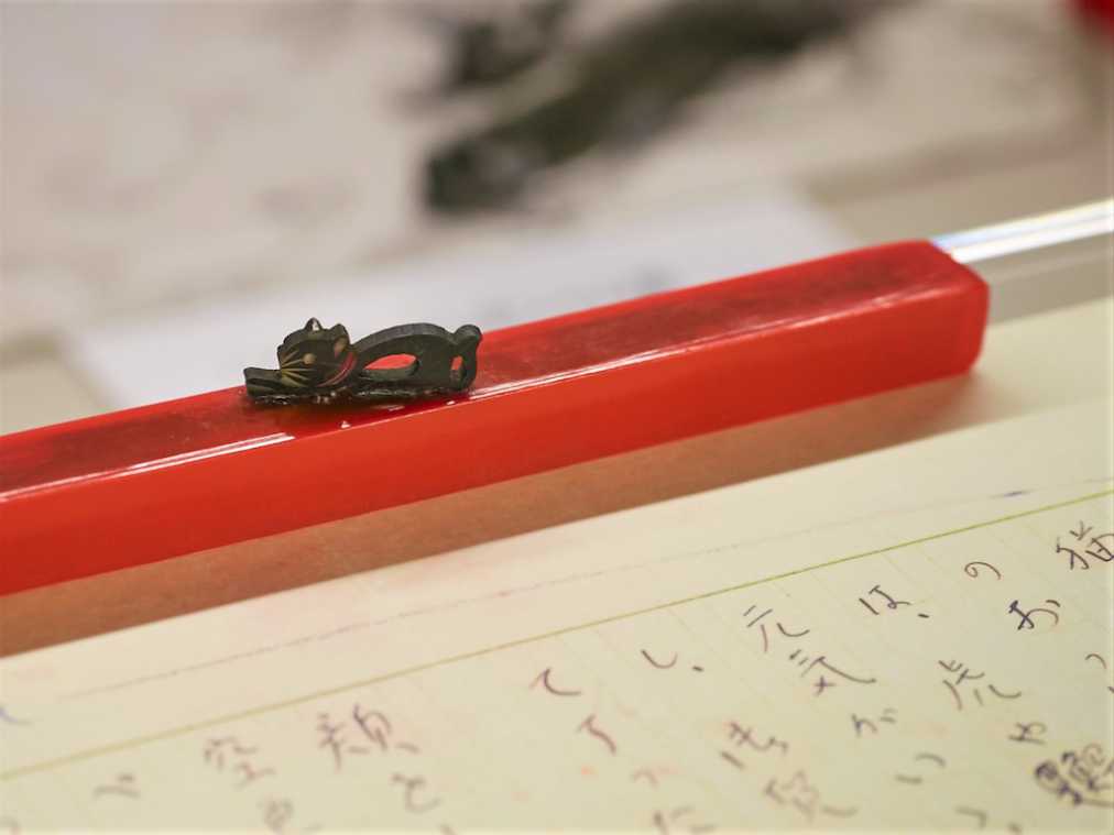 作品の横に猫の置き物がさりげなく置かれていたり、直筆原稿の文鎮をよく見るとここにも猫がいたり。見逃してしまいそうな展示ケースの中も猫でいっぱいです。