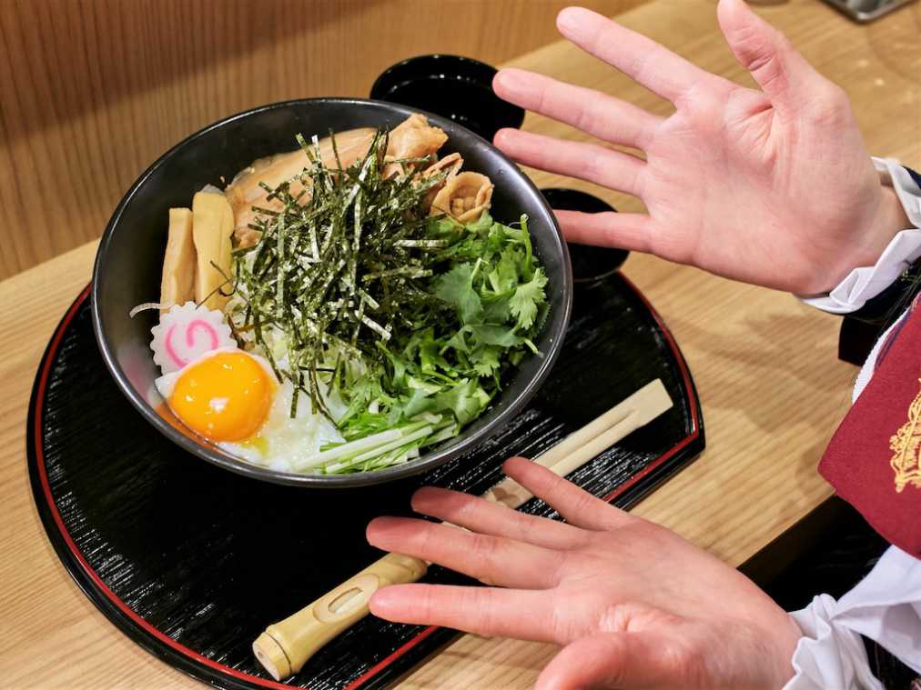 もえあずイチオシは「ネギゴマ+温泉卵+豚バラ」と「パクチー+温泉卵」のセットトッピングのダブルのせ!お肉はハズせないし、温泉卵のとろとろ感も大事。パクチーとネギゴマで味に強めのアクセントをプラスします!