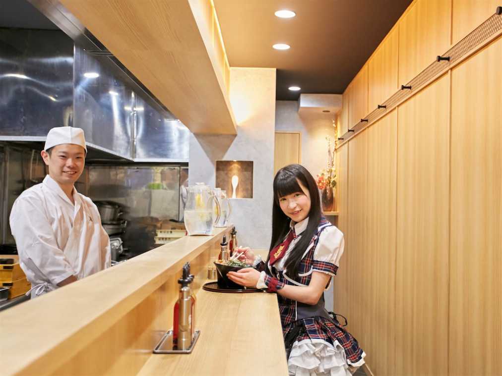 コンセプトは板前さん。清潔感のある店内に流れるBGMは、お琴や三味線など和楽器が奏でるメロディーなんです。カウンターに座るとすぐに、さりげなくおしぼりを渡してくれるのも油そば店としては珍しいですよね。それでいて“食券スタイル”というのが、気取らなくて私は好きなんです!