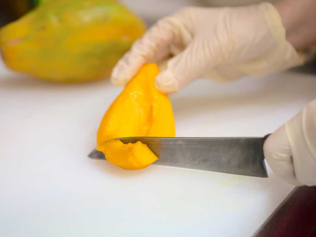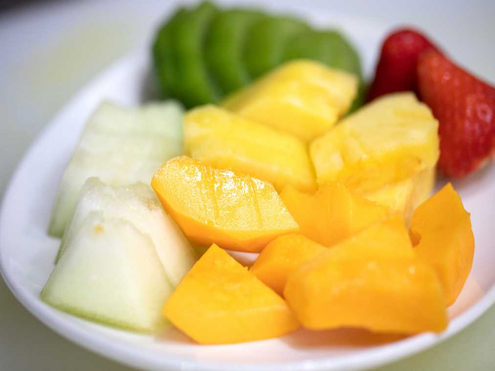 近所にある本店の果実店「ヤオイソ」から届く新鮮なフルーツを店内でカットしています。