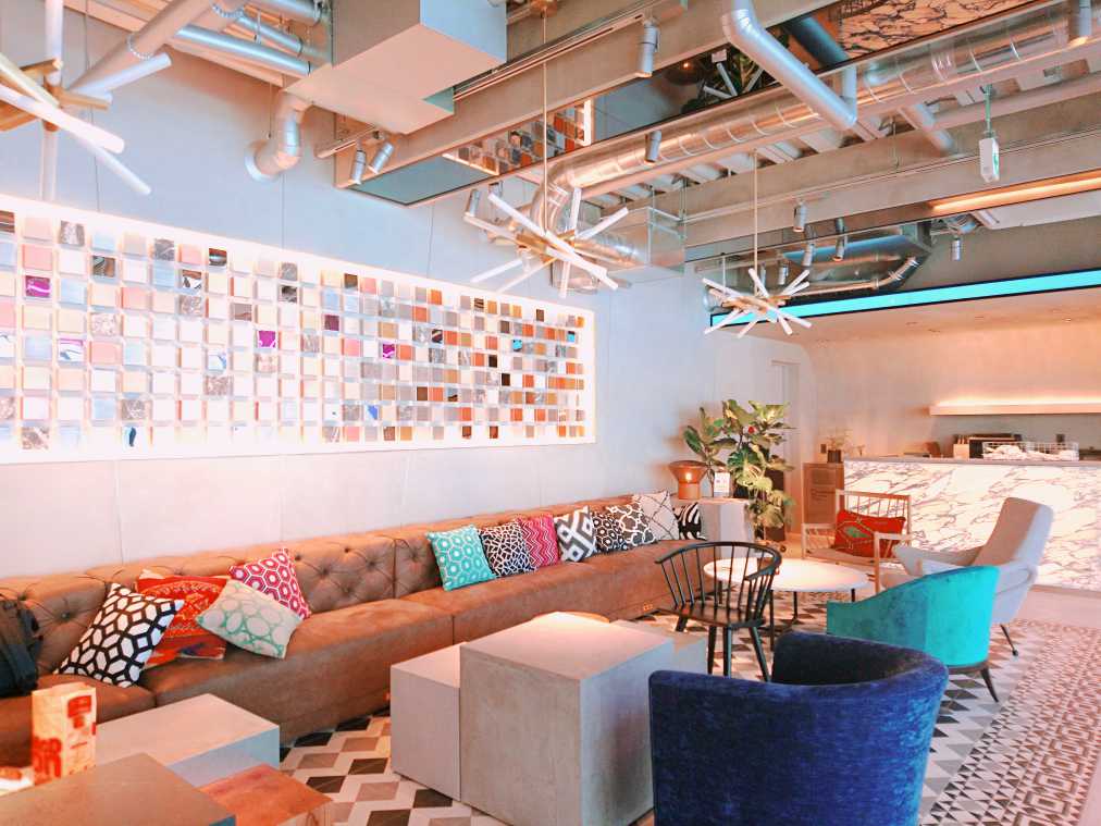 フロントのある4階の奥には、とってもおしゃれなラウンジが!ドロップイン料金を支払えば、ラウンジはもちろんセルフキッチン(食材は持ち込み)の使用もできるほか、朝はパンが食べ放題、コーヒーも終日無料で飲むことができます。