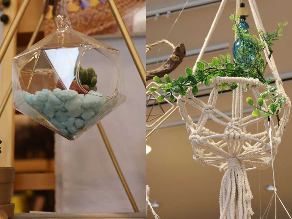 ガラスのテラリウムにエアプランツを飾ったり、コットンローブを編んだ、ナチュラルなハンギングバッグに植物を飾るだけでも、港町のようにゆったり時間が流れそうな、癒やしの空間に。