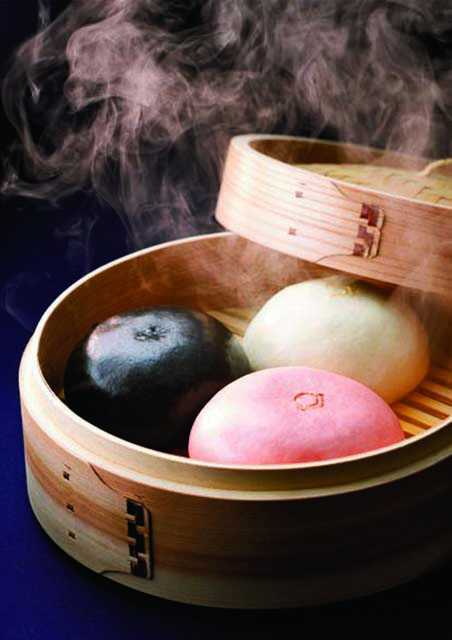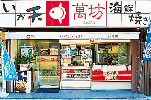 いか天や、3色のいかまんじゅうがおいしい「萬坊 朝市通り店」では、アツアツのできたてを頬張る至福の時を楽しんで。