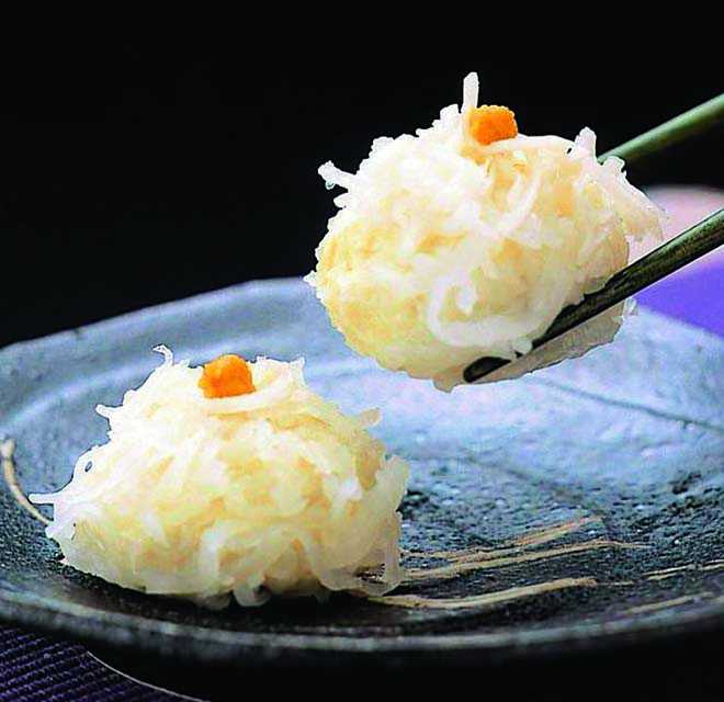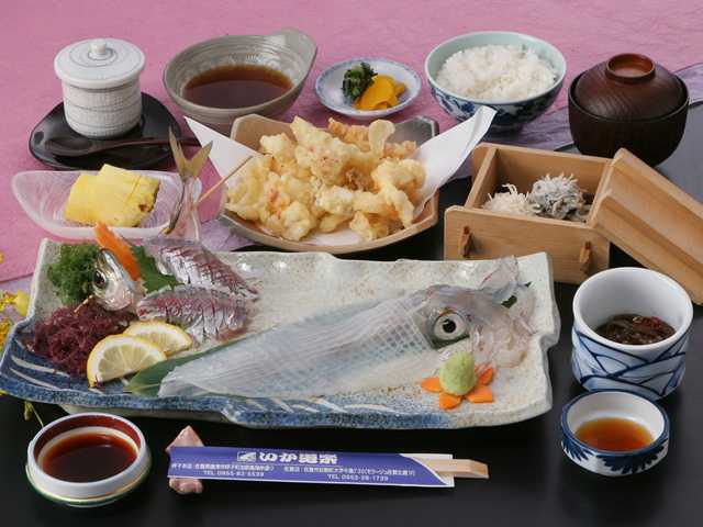 イカ漁が盛んな呼子の名物はイカの活造り。鮮度抜群なまま素早く刺身にされたイカが、お皿の上で躍ります。こりこりした食感に上品な甘さが相まって至福のおいしさです。刺身だけでなく、煮つけ、てんぷら、いかしゅうまいなど、ぜいたくなイカづくし膳で満腹に!