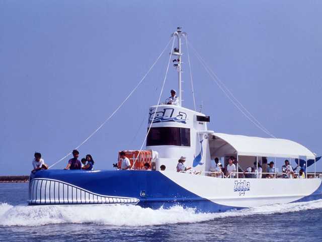 クジラのデザインがかわいい「ジーラ」は、半潜水型の海中展望船。船の底半分は海中に沈み、両側にある大きな窓から、海中や魚を鑑賞できます。デッキには気持ちのよい海風が吹き、快適な海上散歩を楽しめます。