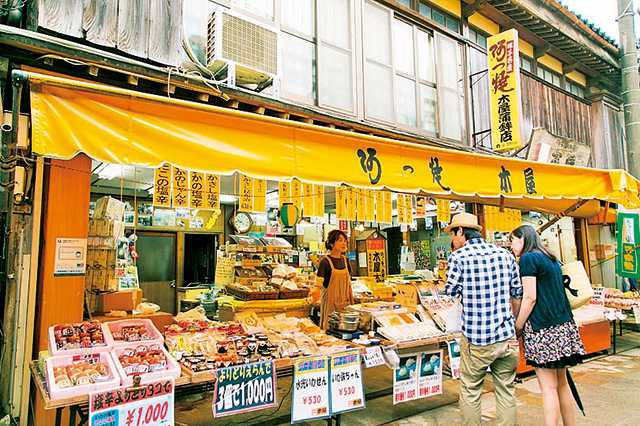 幅広い品ぞろえの食料品店「こみや」では、独自に開発したイカ専用醤油「朝市通り醤油」を購入。まろやかな口当たりでイカの刺身をさらにおいしくしてくれます。