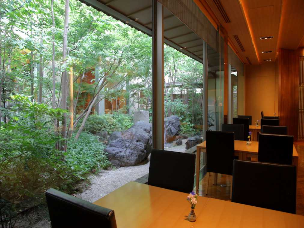 床から天井までの大きなガラス窓からは中庭の景色が楽しめます。店内は照明に和紙を使ったり、格子を壁にあしらったり、日本の伝統美を随所に取り入れた和モダンな空間。すべてテーブル席で、リラックスして食事を満喫できます。