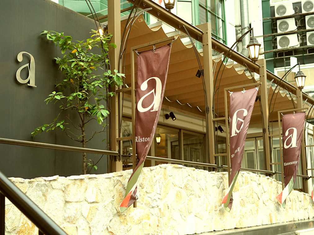 渋谷駅ハチ公口から徒歩5分。賑やかな大通りから一歩入った、宇田川町の路地にレストラン「a」はあります。どことなく大人な雰囲気が漂い、静けさすら感じさせる一角。たなびく“a”の旗に誘われて、さあ、お店へ入ってみましょう。