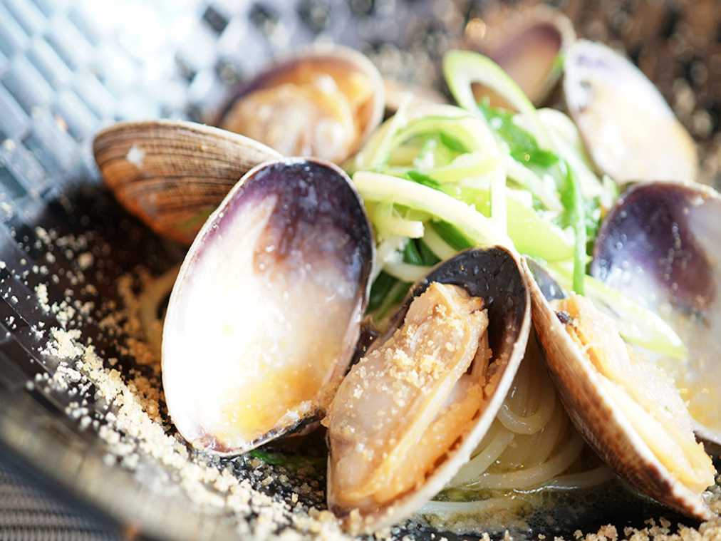 見てください、この肉感!ほどよくニンニクと塩味が利いた大ぶりのあさりは、九条葱とアルデンテなパスタとの相性も抜群です。