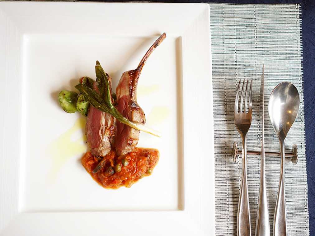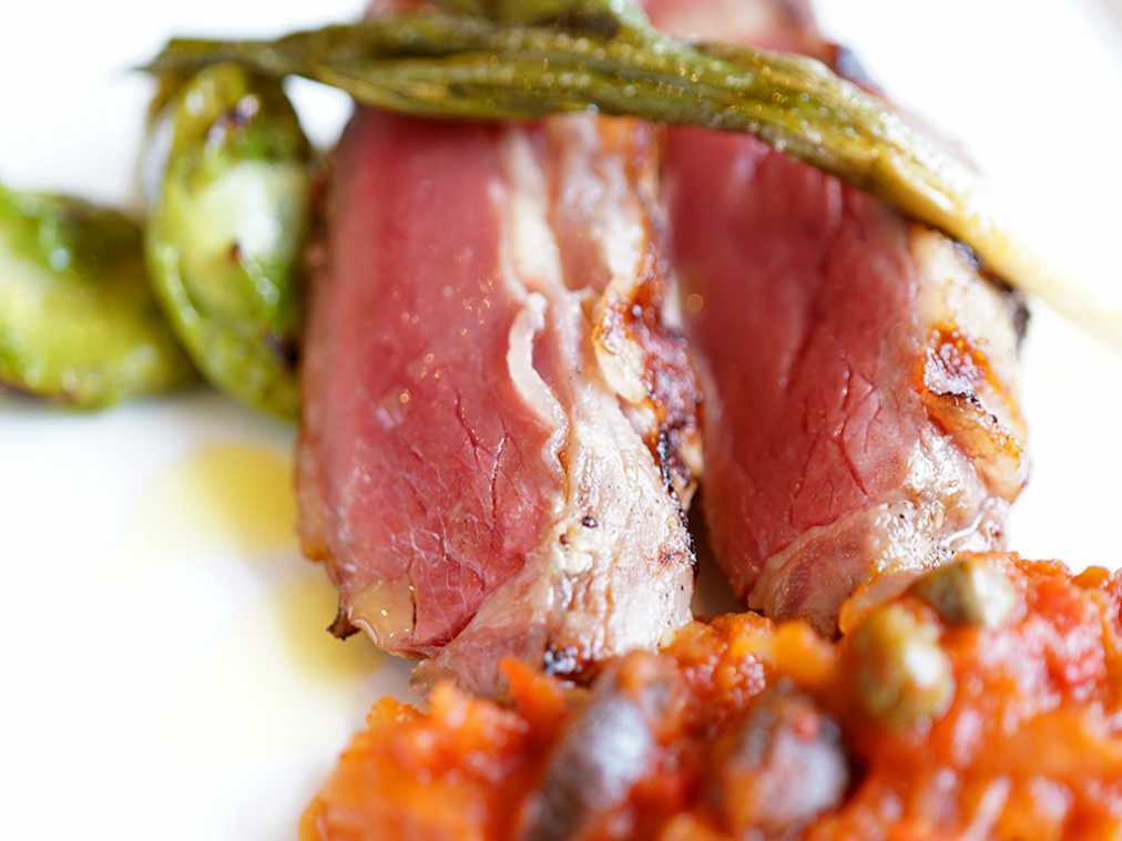 さて、いよいよメインディッシュ!メインは魚、肉料理からチョイス。取材時のお肉料理は「塩麹で漬けた仔羊とイベリコ豚のアッヴォルト プッタネスカソース」。仔羊とイベリコ豚って、どんな組み合わせ?と、疑問に思いましたが、ひと目見て納得!