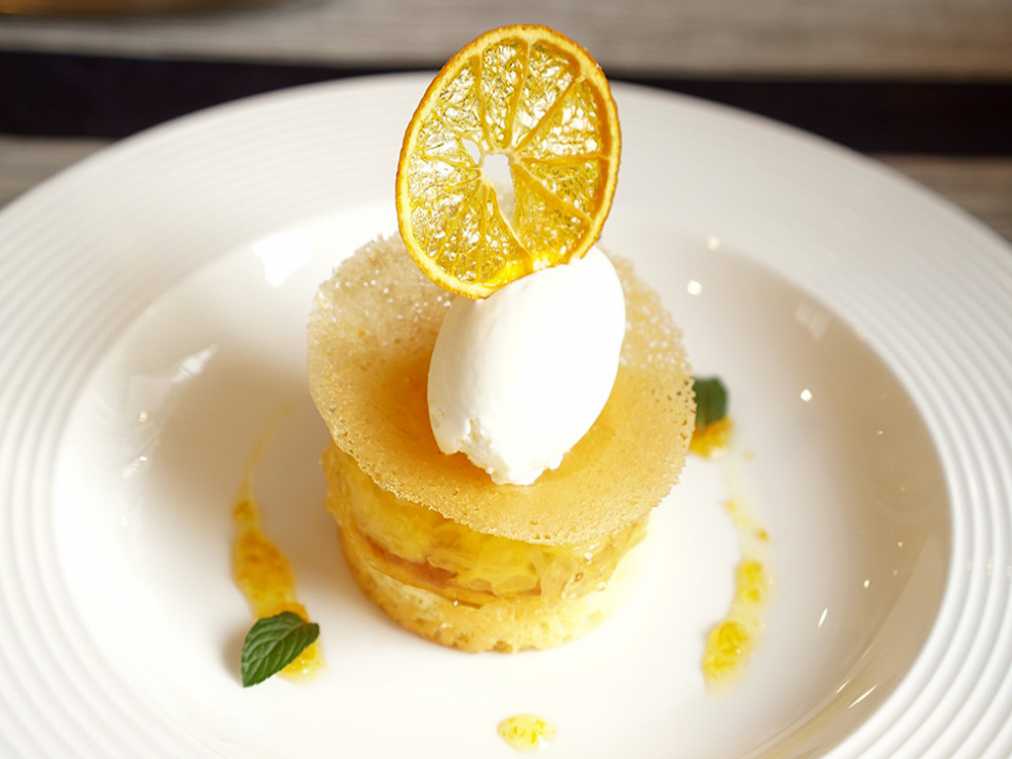 オレンジの果肉たっぷりのゼリーとリキュールの効いたスポンジ“ババ”、マスカルポーネのジェラートの三層になっている、ゴージャスな一品です。お皿にあしらわれたミントと一緒に口に入れると、それぞれの味が際立ち、想像以上のおいしさです。