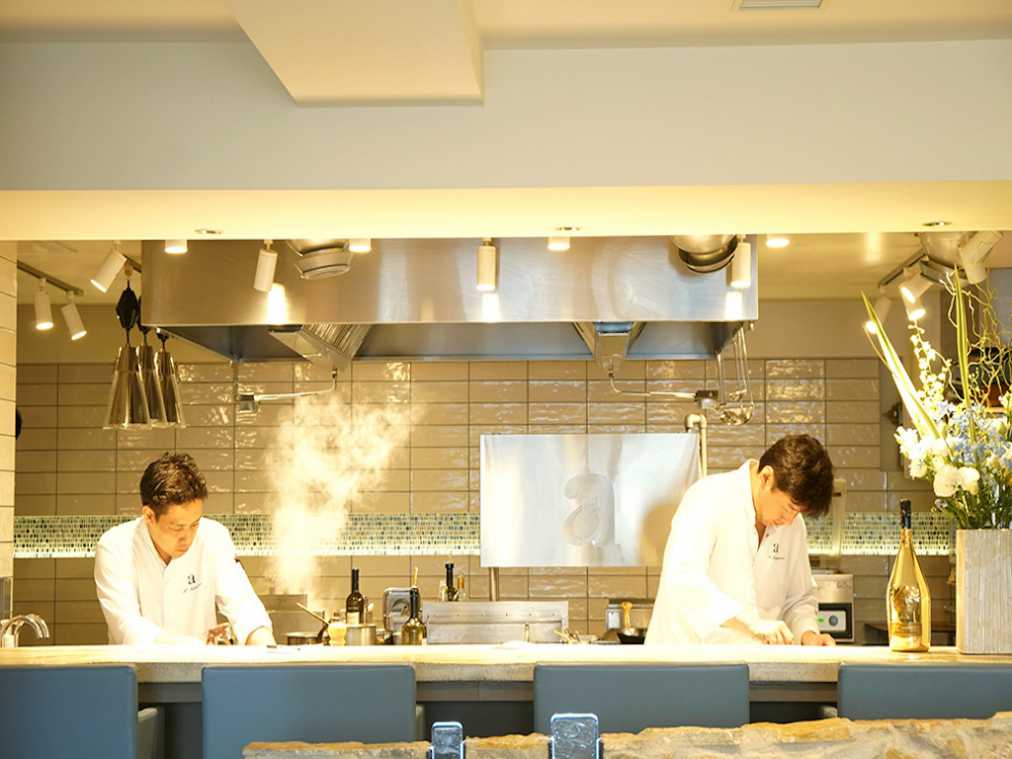 店内でまず目に入るのは、広いオープンキッチン。調理している様子が間近で見られて、ライブ感満点!右が宮川健一総料理長。宮川さんは、1988年に「KIHACHI」に入社。数々の店舗の立ち上げに携わり、最終的には「KIHACHI本店」料理長として活躍しました。