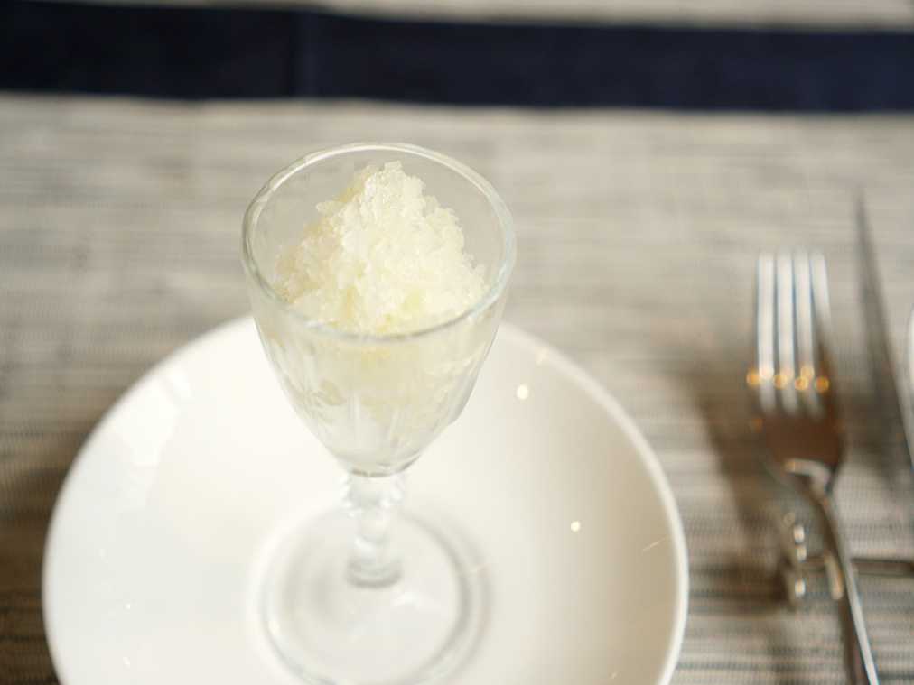 パスタのあとは、お口直しのシャーベット。ゆずのキリリとした味が、メインディッシュへの仕切り直しをしてくれます。中にはキューブ型のゼリーが入っています。