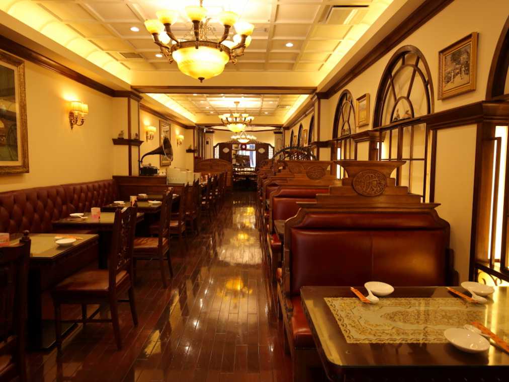 1階は、華やかな社交場だった「上海クラブ」をイメージしたメインダイニング。革張りの椅子や、アンティークのライトが気分を盛り上げます。