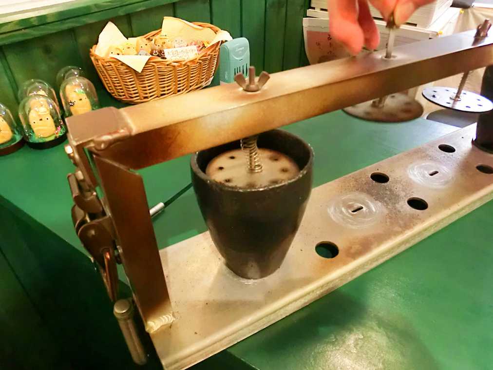 黒色のコップのようなものがトトロの鋳物型。特殊なバネの力で押さえて焼くことで、生地の膨らみを調整しています。これがないと“トトロの耳”が立たないのだそう。白髭さんが試行錯誤しながら編み出した、世界にひとつのシステムです。