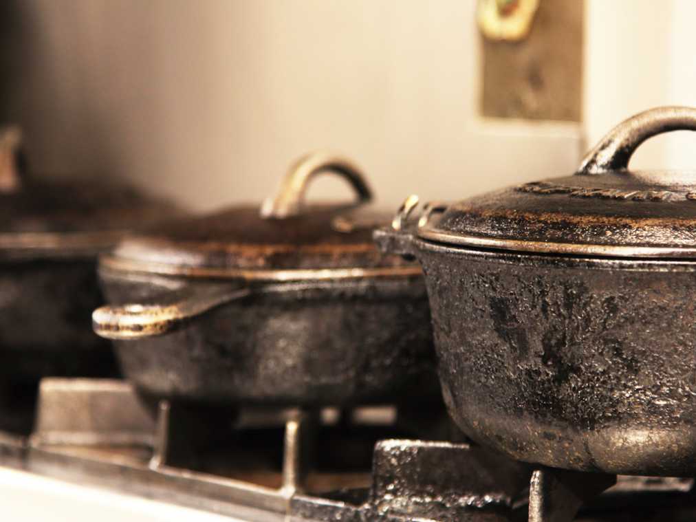 厨房には黒光りするダッチオーブン(鉄鍋)がずらり。アメリカの開拓時代にオランダ系移民が売り歩いたことで「ダッチ=オランダの」と名付けられたのだそうです。