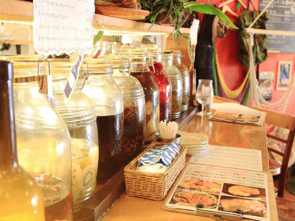 カウンターにはイチゴやブルーベリー、いちじくなどの自家製の果実酒が並んでいます。そんな瓶に入った手作りドリンクでアウトドアな雰囲気もさらに高まります。ソーダやミルクなど、自分でお好みの割り方を選ぶことができますよ。1番人気は4種類のベリーを漬けたお酒をソーダで割ったものだそう。