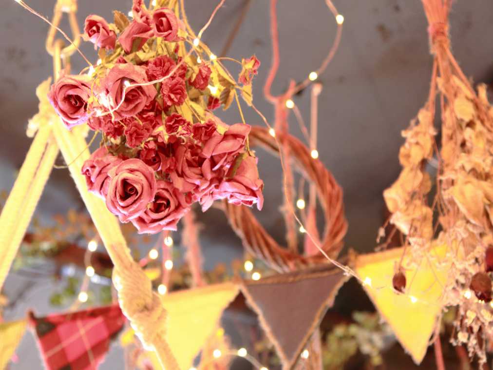 優しい暖色系の照明が灯された天井には、フラッグガーランドとたくさんのドライフラワーがフォトジェニックで、まるでガーデンパーティのような空間です。