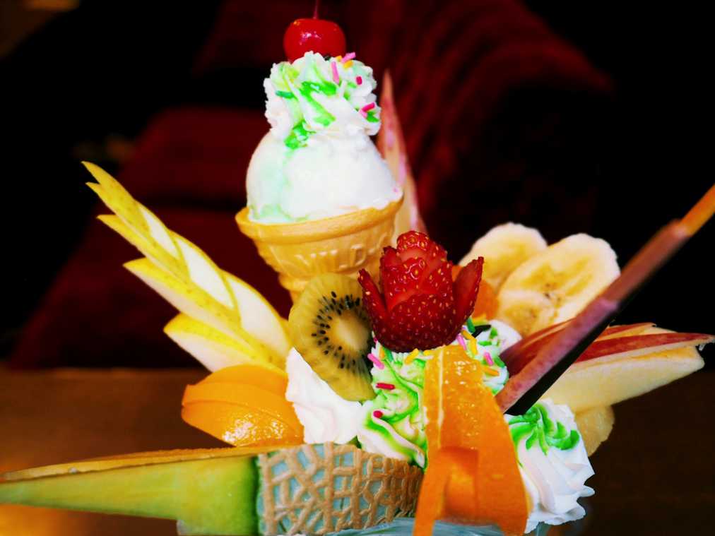 器にはメロン味のシロップとバニラアイスがたっぷり詰まっています。その上に、美しくカットされたフルーツがずらり。りんご、青りんご、パイン、バナナ、メロン、オレンジ、黄桃、キウイ、チェリー…フルーツ好きにうれしいラインナップがこれでもか!とばかりに盛られています。ビタミンもたっぷり摂れそうですね。