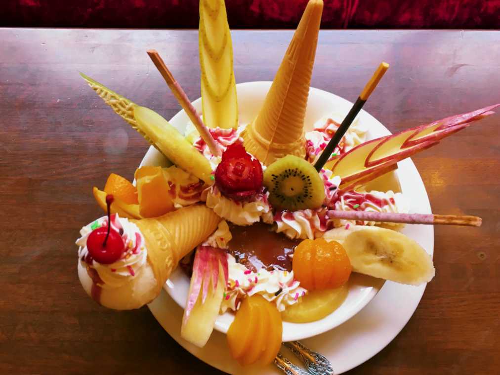 「すごい!」としか言いようのないサイズ感のパフェが運ばれてきました!こちらが「フルーツパフェ」(1100円)です。トッピングに注目してください。コーンアイスが載ったパフェなんて、なかなかお目にかかれないのではないでしょうか?悠に15センチはある大きさです!