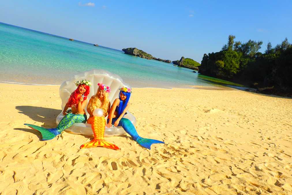 マーメイドスイム体験ができるのは、沖縄・恩納村のプライベートビーチ。きれいな砂浜、目の前に広がる美しい海…周りの目を気にする必要もない場所で、小さいころに憧れた「アリエル」のような人魚姫に変身!夢みたいな時間を過ごしましょう。