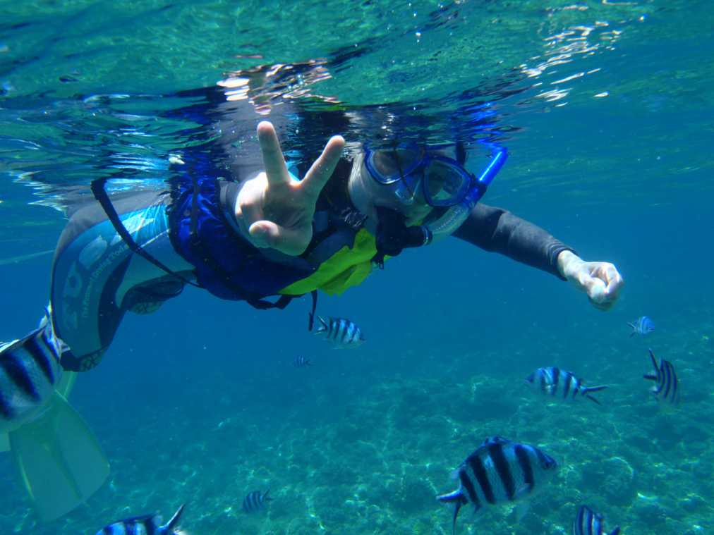 シュノーケリングで、カラフルな魚と一緒に海中散歩