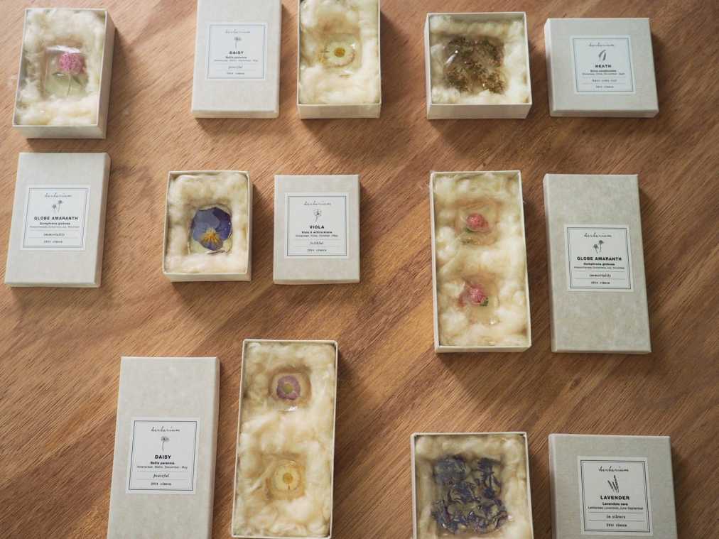 そんな、ストーリーが込められた「cineca」のお菓子は思わず見とれてしまうほどの美しさです。こちらはエディブルフラワーと澄みきった飴で作りあげた「herbarium(ハーバリウム)−甘い標本−」。まるで水晶のなかに花を閉じ込めているかのような美しさです!その透明感に、ついお菓子であることを忘れて見入ってしまいます。