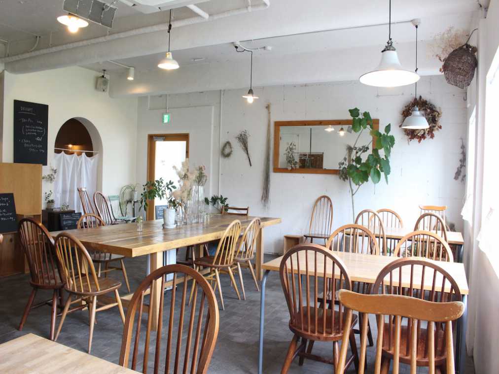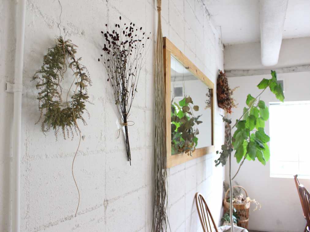白い壁のあちこちに飾られたドライのハーブやリースは、植物が好きなオーナーの濱野さんがあしらったもの。さりげないおしゃれな雰囲気は、インテリアの参考にしたくなります。