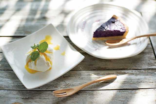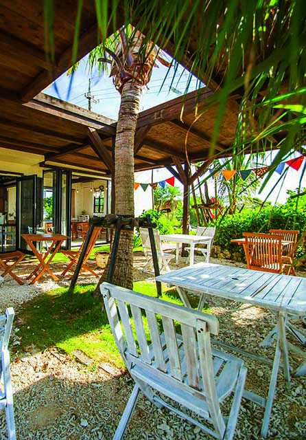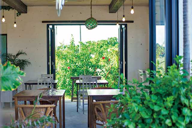 両側の窓から風が通る開放的な店内は、白を基調とした居心地のいい空間です。島野菜を豊富に取り入れたカレーやタコライスなど、食事メニューはもちろん、キュートなスイーツも。自然豊かな庭を眺めてのんびり沖縄時間が流れる、リラックスしたランチタイムが過ごせます。