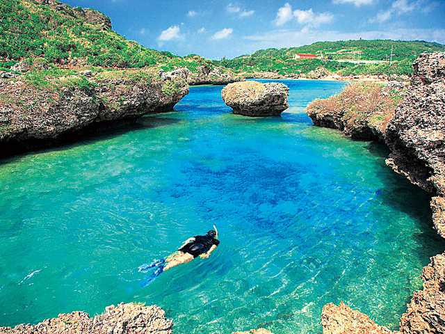 大橋を渡って宮古島へ戻ったら、海岸線を西にドライブ。20分ほど走った先にある、天然の入り江を生かした個性派ビーチが「イムギャーマリンガーデン」です。ビーチを岩の遊歩道が囲む天然のプールのようになっていて、波は穏やか。岩山の頂上にある展望台からはどこまでも続く大海原も望めます。