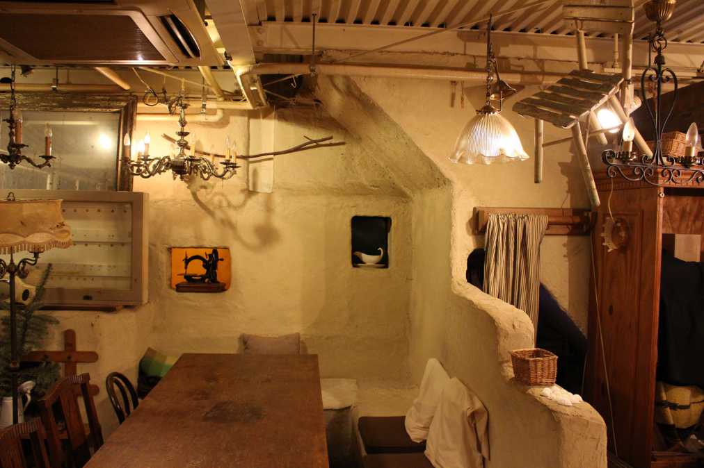 店内は、オーナーたちがDIYで改装。わざと凹凸を出して加工した白壁に、アンティークのシャンデリアやランプが吊り下げられた空間は、異国情緒満点!見上げると、雑貨が吊り下げられていて、オーナーの遊び心も感じられます。