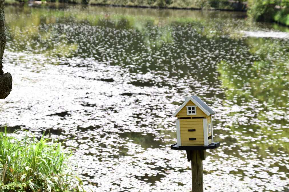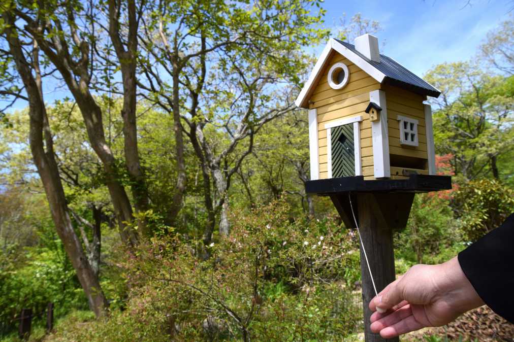 木立のなかにあるかわいらしい鳥の巣箱も実はオルゴール。紐を引くと澄んだメロディーが流れてきます。