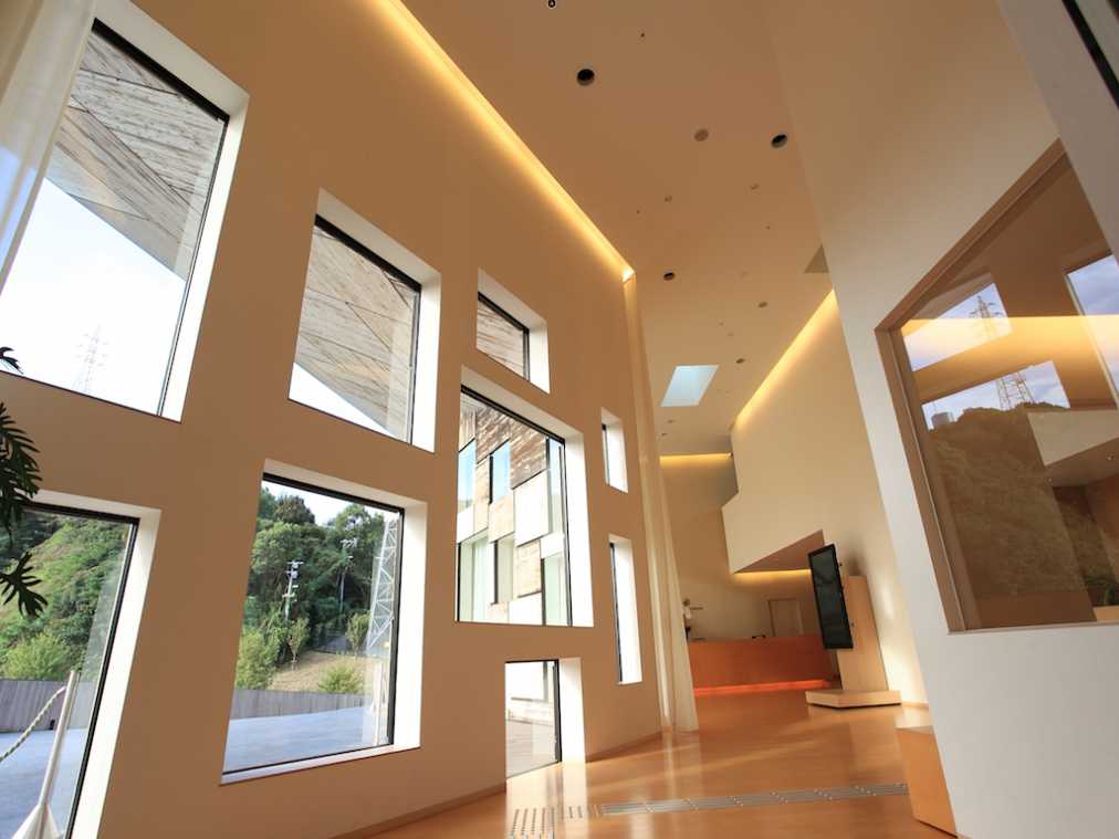 館内は太陽の光が柔らかくふりそそぐ、心地よい雰囲気。そして印象的なのは、装飾品などがいっさいない大胆でシンプルな壁に設えられた大小さまざまな窓です。