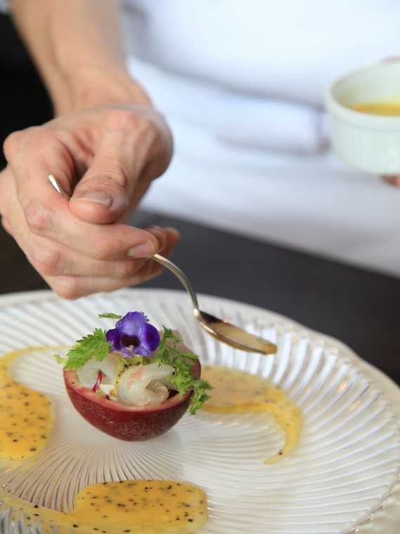 長崎産の厳選素材を主役に、一皿ずつ丁寧に仕上げられたフレンチのコース料理。食べるのがもったいないような華やかさや繊細さはもちろんのこと、その深い味わいからシェフのこだわりが伝わってきます。