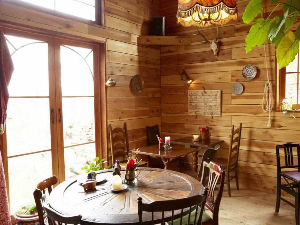 もともと東京で飲食店を経営していた橋本さんご夫婦が、2014年にこの地に移住し、柱や梁、基礎といった建物の基本構造以外をご夫婦でコツコツと作り上げたとのこと。木をふんだんに使った壁、ガーデンを望む大きな窓や高い天井が居心地のよさを生み出し、古い木製の車輪をリペアした丸テーブルが存在感を放っています。