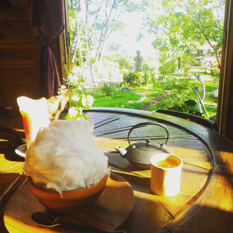 人気はこだわりの和スイーツ。山盛りのかき氷に白玉と赤餡または青餡を添えて味わう「あるぷす」飲み物付き1200円(単品850円)には、日光で人気の松月氷室から仕入れる天然氷を使っています。口に入れるとそのフワフワとした食感にびっくりするほど。白玉や餡の材料もすべて自然栽培および有機栽培によるものを使用しているとか。